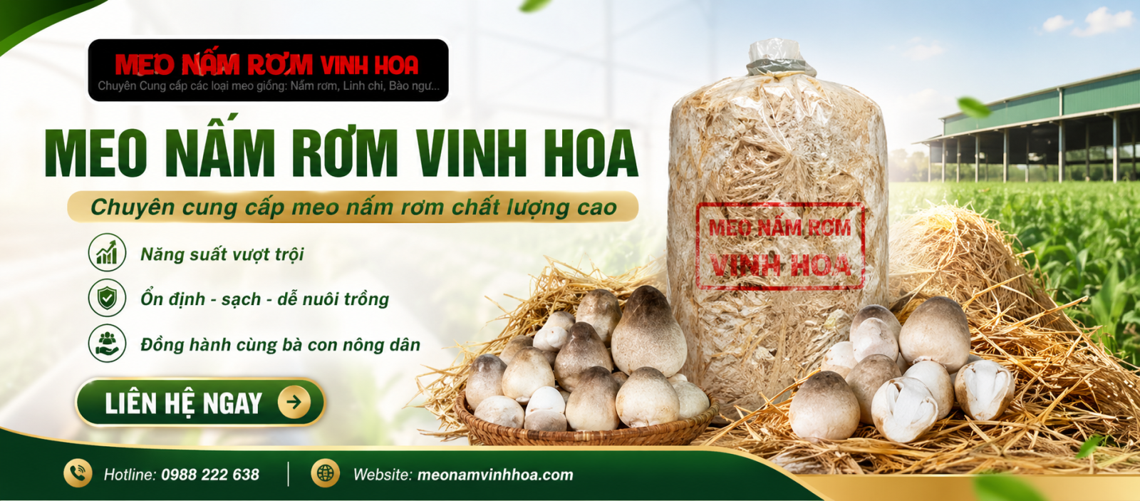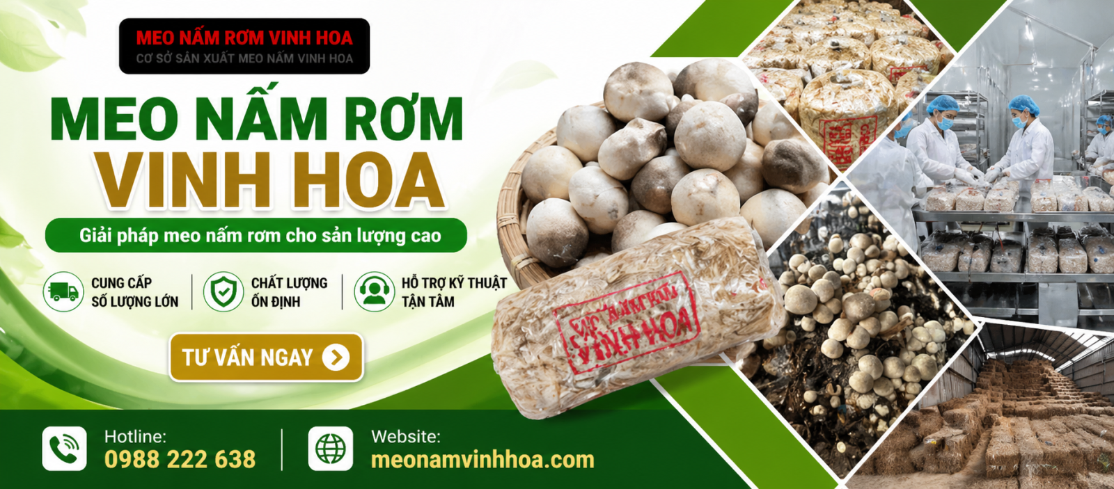 Meo nám Vinh hoa chuyên cung cấp meo nấm rơm chất lượng cao, đạt năng suất vượt trội cho nhà nông. Được các nhà nông, trại nấm miền nam tin tưởng và đồng hành. Mang lại giá trị kinh tế và làm giàu cho bà con nông dân. Sản phẩm được nghiên cứ kỹ lưỡng bởi kỹ sư Nguyễn Quang Vinh - chủ cơ sở meo nấm lớn nhất miền nam hiện nay.